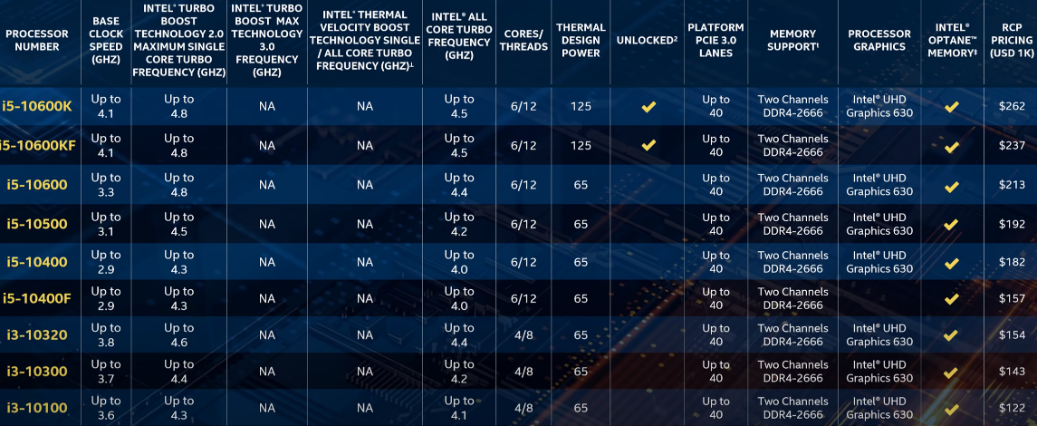 다음은 i5이하 라인업입니다. 가장 눈에띄는건 i5모든 라인업이 6c/6t에서 6c/12t로 쓰레드가 증가하였다는 건데요. 그럼에도 가격은 기존작과 똑같이 출시했는데요. 그러면 i5-10600k모델이 라이젠 5 3600x보다 조금 높은 가격에 충분한 성능을 보여줄 것으로 기대됩니다. 어느정도 가격이 안정되고나면 10400f모델또한 가격을 무기삼아 라이젠 5 3600과 충분히 맞서 싸울 수 있는 성능인데요. 다만 메모리지원이 2666mhz라는 점은 다소 아쉬운데요. 라이젠은 3200mhz부터 기본적으로 지원합니다.