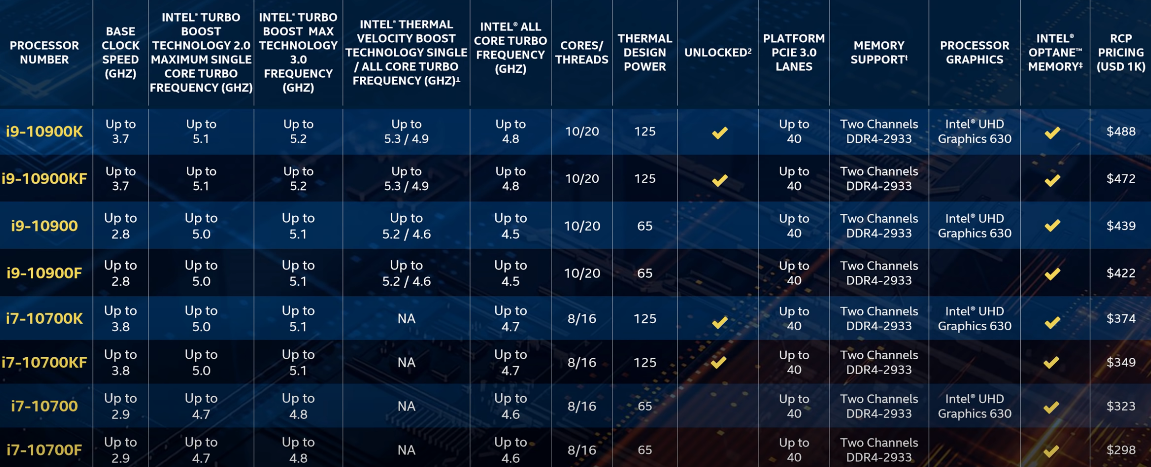 먼저 i7이상 라인업입니다. 전세대 대비 눈에띄는 성능은 아무래도 i7라인업입니다. i7/9700k가 8코어 8쓰레드였던 반면 이번 i7-10700k는 8코어 16쓰레드인데요. 물리적인 코어의 증가는 아니지만 전세대 i7과 i9수준의 차이를 보여줌에도 RCP가 374$(1223원 환율계산시 45.7만원)로 9700k의 출시가와 같습니다.