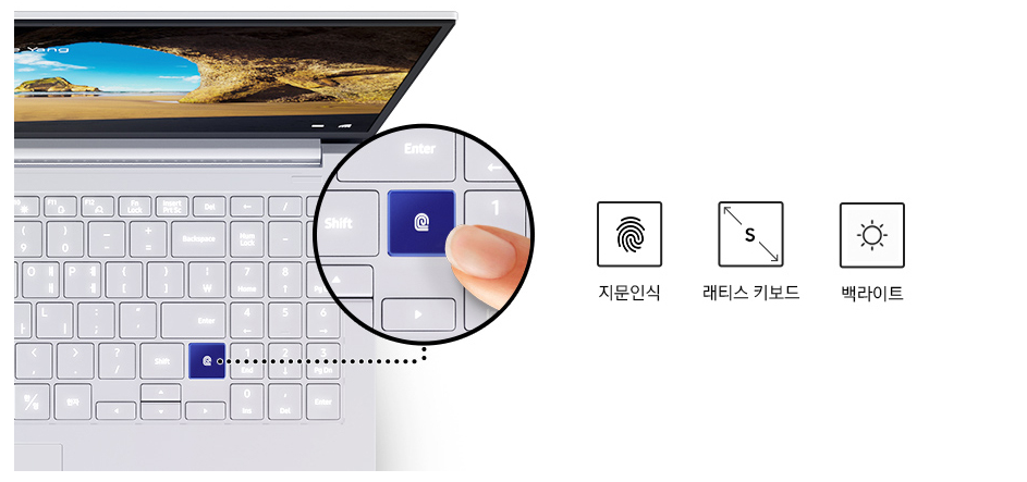 15.6인치의 센서위치는 참 애매합니다. 한손으로 펼치기 애매할테니 그냥 중앙에 넣은 것일까요. 아무래도 키패드와 독립된 공간에 지문센서를 넣는건 설계상 어려웠나봅니다. 막상 13.3인치와 비교해도 크게 어색한 것은 없지만, 13.3인치처럼 프레임을 잡고 열면서 지문으로 잠금을 푸는게 안된다는 건 조금 아쉬웠습니다. 물론 hello 얼굴 인식으로 잠금을 푼다면 전혀 상관없는 문제입니다.