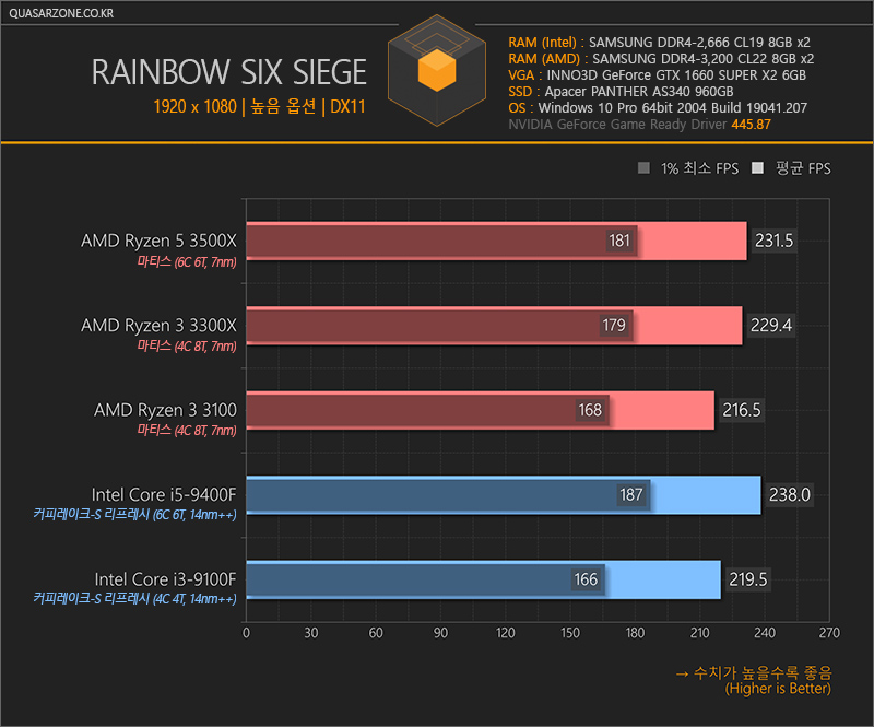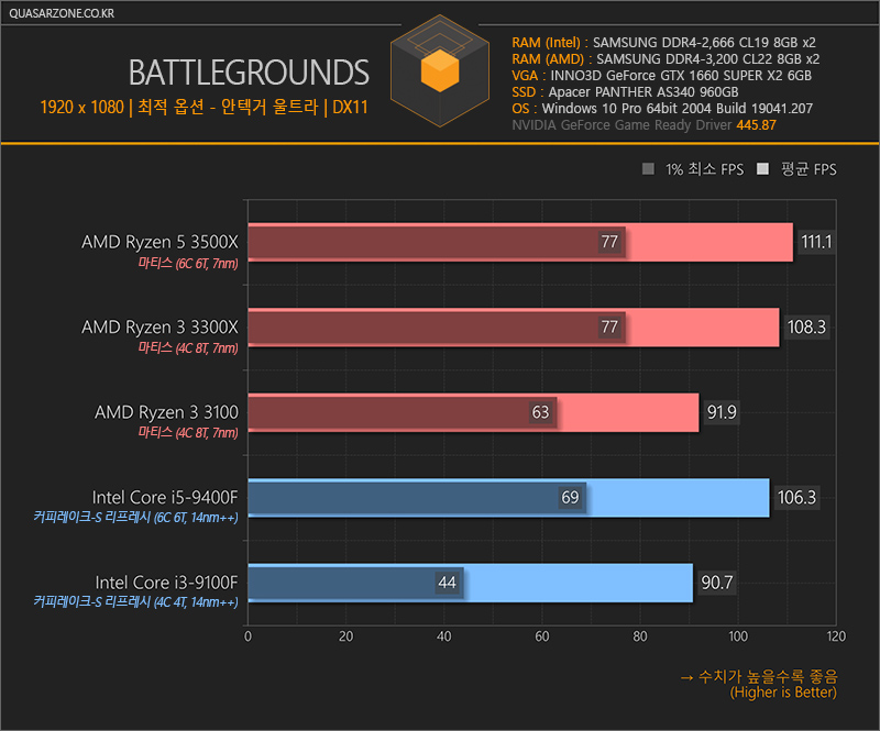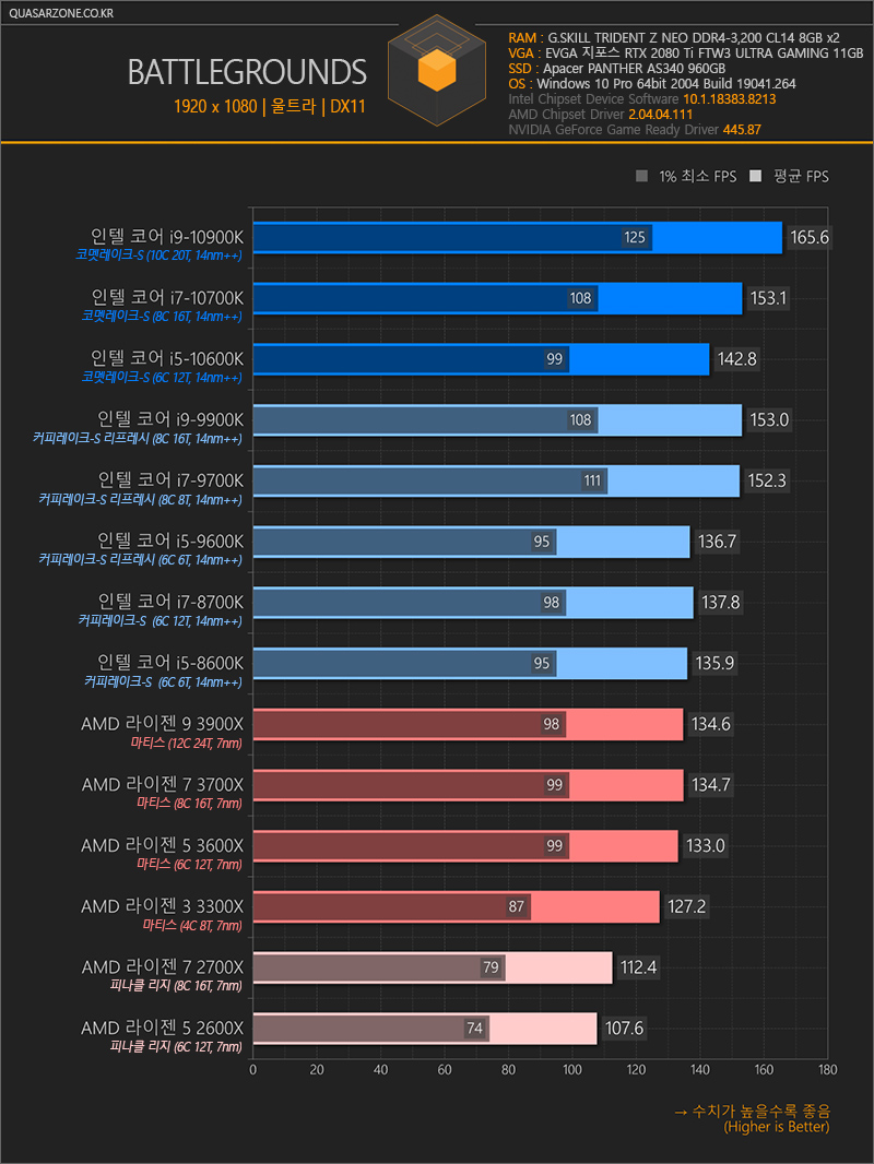 국내에서 가장 많은 유저들이 플레이하는 게임, PUBG(배틀그라운드)와 오버워치, LOL(리그오브레전드)에 대한 CPU 벤치마크 결과입니다. LOL같은 경우 사실 사양을 많이 요구하는 게임이 아니다보니 벤치마크를 찾지 못해 조금 신뢰성이 떨어지는 자료를 찾아왔는데요.