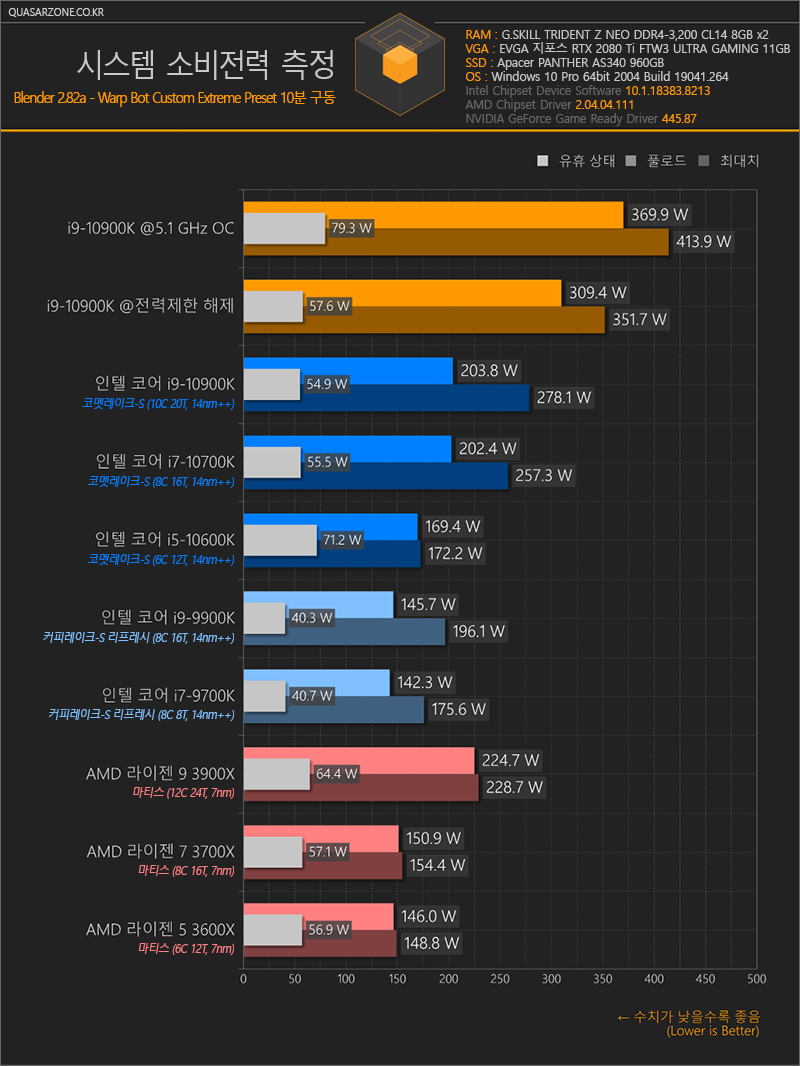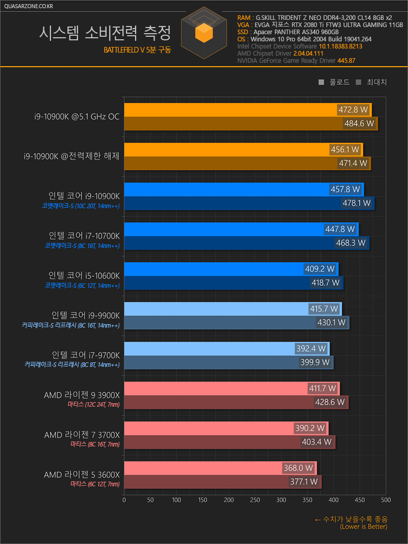 다만 i7-10700k는 전세대 i9처럼 풀칩이 아닌 컷칩이다보니 i9-9900k와 비슷한 성능을 보이면서도 온도차이가 좀 보이는데요. i5-10600k의 경우에는 반면에 온도가 그리 높지 않고 전력소비량도 무난합니다.