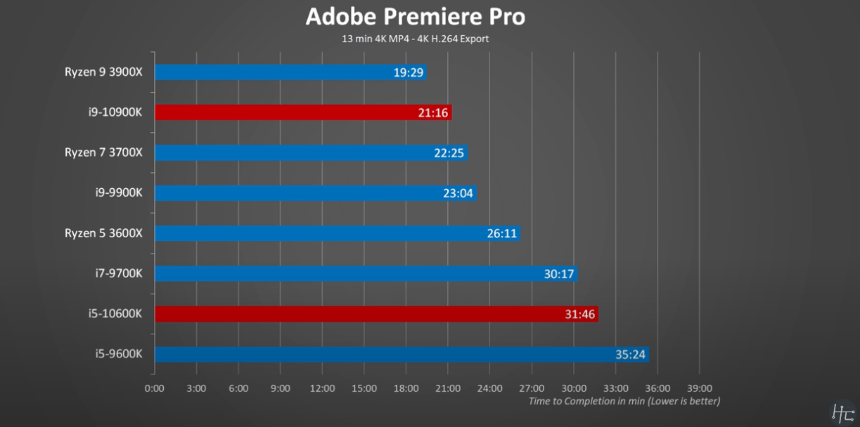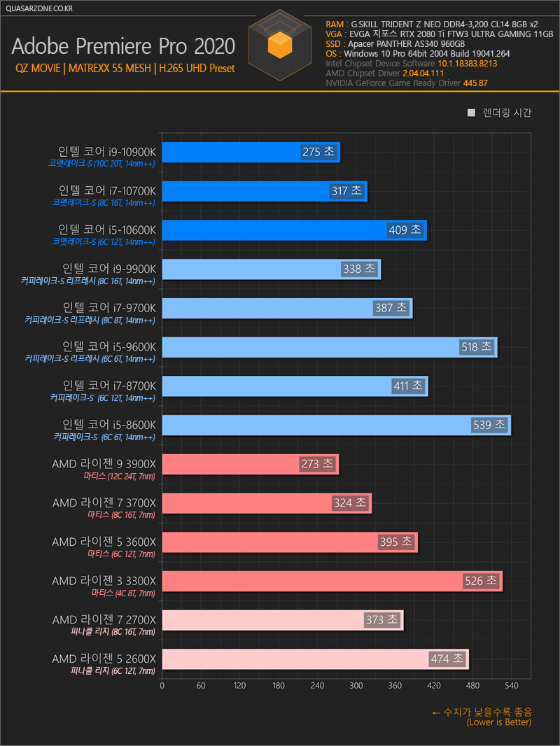 물론 벤치마크가 실성능이랑 직결되는건 아닙니다. 실제로는 단일코어클럭이 가장 우수한 i9-10900k같은 경우 어도비 포토샵과 같이 단일코어를 사용하는 프로그램에서 성능우위를 보이고, 프리미어 렌더링에서도 2코어 4스레드의 물리적 차이보다 적은 성능차이가 나타나는데요. 친인텔기반의 프로그램을 사용하는 이용자에게 i9이 3900x보다 더 좋은 선택이 될 수 있다는 것이죠.