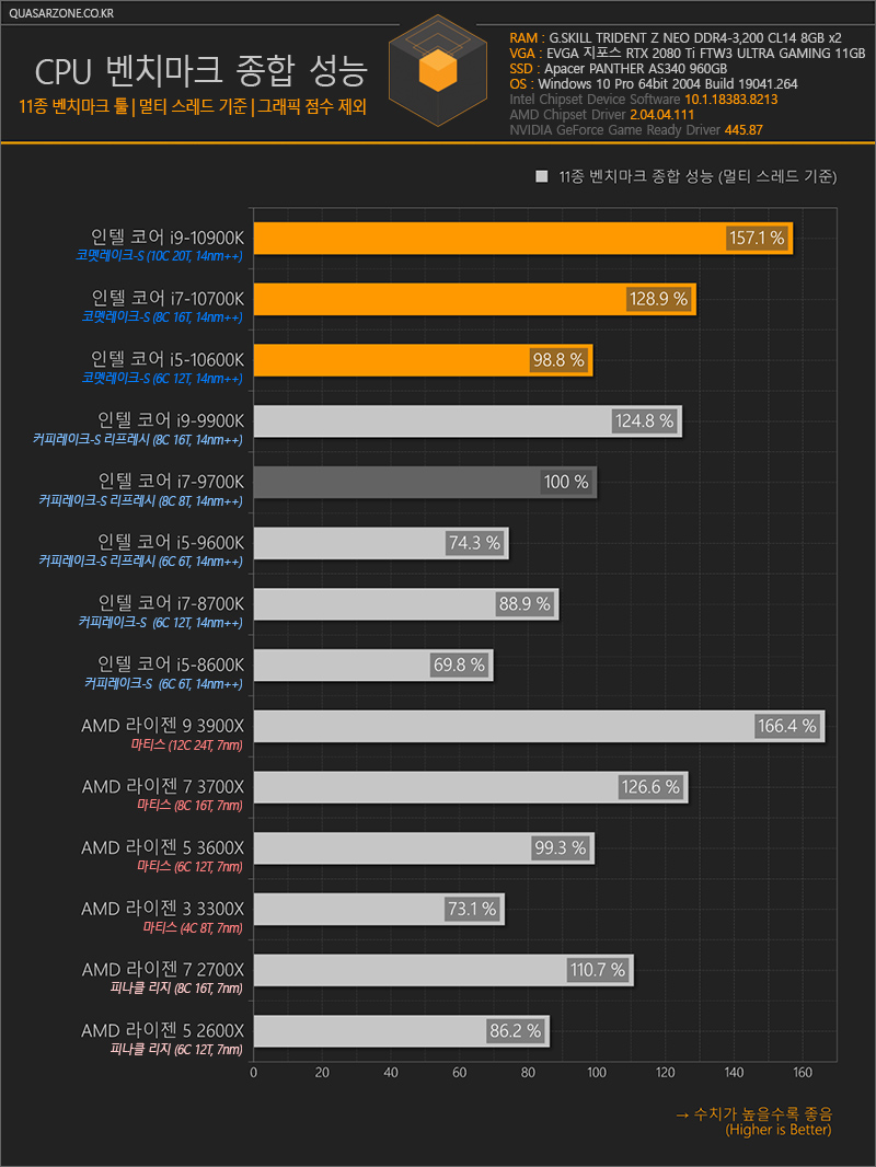다만 i7-10700k는 조금 애매한 입장입니다. 3700x보다 조금더 우위에는 있지만, 가격차이가 사실 상당히 심하죠. 단순히 작업이 위주라면 i7-10700k를 구입하는건 조금 비효율적일 것 같은데요. 뒤에서 살펴볼 게이밍성능까지 더해야 정확한 평가가 가능할 것 같습니다.
