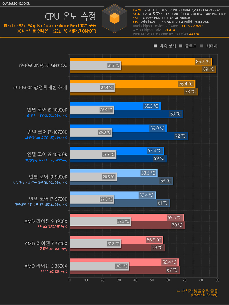 9세대 이후의 인텔 CPU는 사실상 전력제한 해제를 해주어야 실성능에서 인텔이 공언한 클럭을 사용할 수 있는데요. 따라서 보시다시피 게임이든 프로그램이든 실사에 초점을 맞추면 AMD보다 전력소비량이 큰 것을 볼 수 있습니다. 다만 i9-10900k의 경우 생각보다 온도가 높지 않은데요. 전세대가 너무 치명적으로 온도가 높았던 편이라 코어가 늘어났는데도 불구하고 벤치마크에서 보이는 정도의 온도라면 꽤 괜찮아 보입니다.